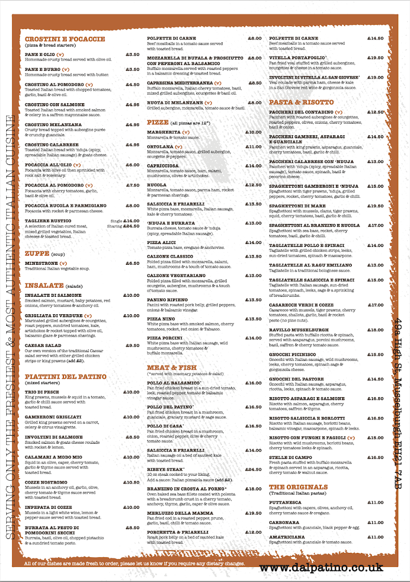 In summary, Dal Patino's menu delivers a full Italian experience with an emphasis on fresh ingredients, classic flavors, and a warm, inviting atmosphere. Whether you're craving seafood, meat, pasta, or pizza, you'll find a perfect dish to enjoy at this charming Musselburgh gem.